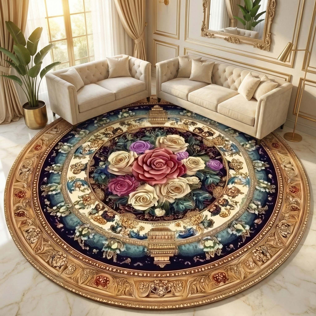 Anti Skid Rugs Non-Slip Round Persian Floral Ethnic Pattern Heavy Carpet for Living Room Bedroom Dining Home Office